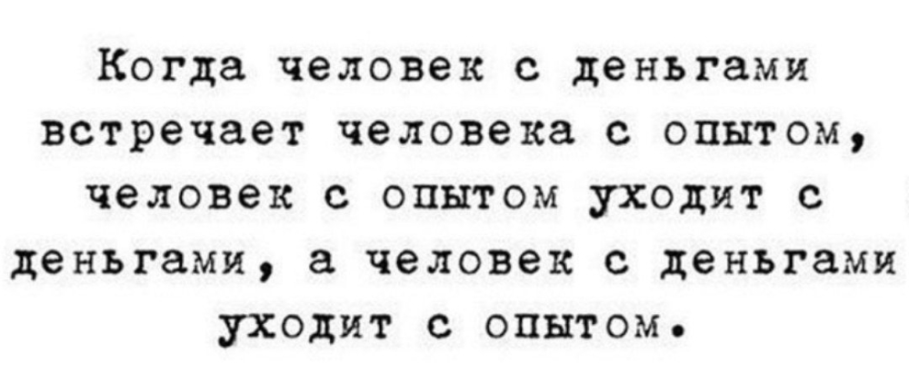 Когда человек с деньгами встречает человека с опытом, человек с опытом уходит с деньгами, а человек с деньгами уходит с опытом