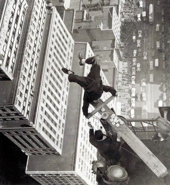 Акробат выполняет трюк на доске у самого края крыши небоскрёба, США, 1939 год.