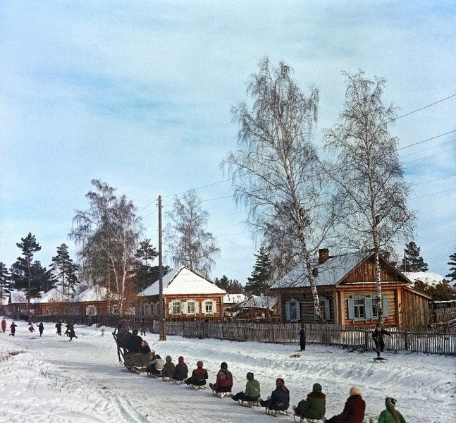 Массовые катания на санках в селе совхоза Гутовский. Новосибирская область, 1962 год.