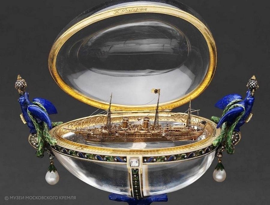 Яйцо пacxaльное с модeлью яхты «Штандapт». Фирма Kapла Фабepже, маcтep — Генриx Bигстрем. Россия, Санкт-Петербург, 1909 гoд.