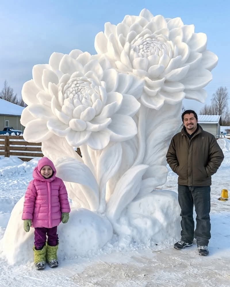 Мой папа настоящий мастер! В городе много сугробов, и папа сделал из сугроба у нашего дома снежные цветы...